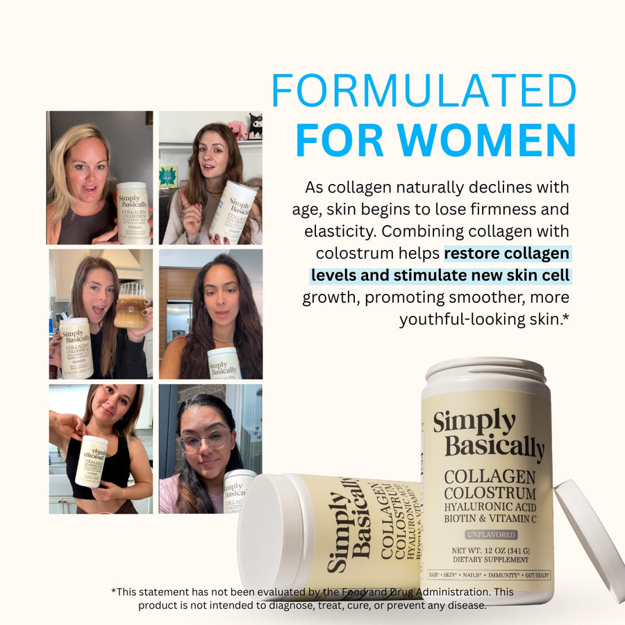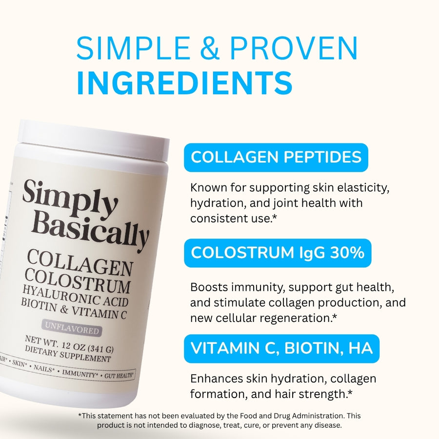 Simply Basically’s Collagen + Colostrum powder combines hydrolyzed collagen peptides, bovine colostrum, hyaluronic acid, biotin, and vitamin C. This blend is formulated to provide nutritional support for hair, skin, and nails.